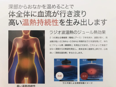 ラジオ波が体の中でぶつかるので、体の中からポカポカと温まるような、気持ちの良い感じがあります。
